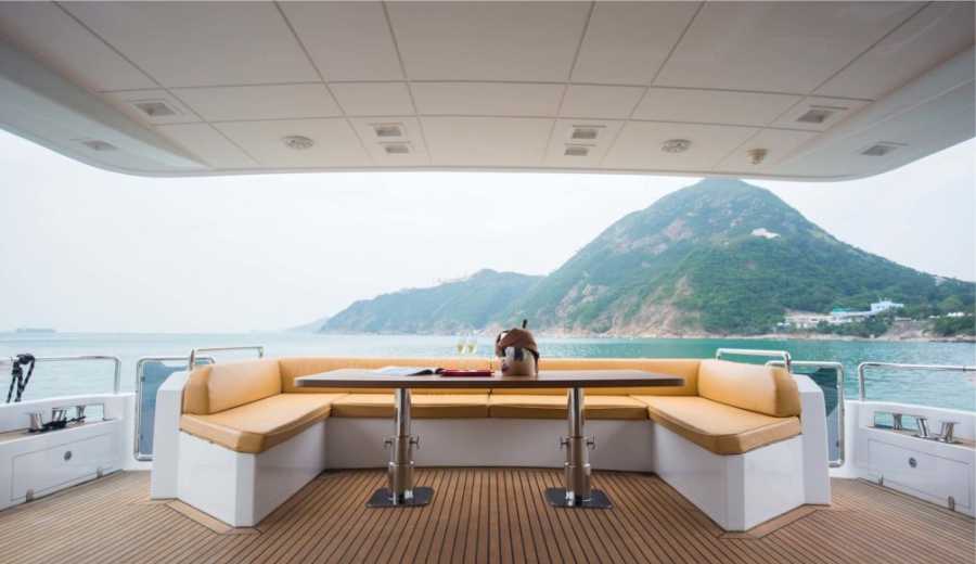 The front deck has sunbeds for guests to luxuriate in the sun while been caressed by the sea breeze while the stern provides a shaded respite for some al fresco dining or relaxation. The top deck provides yet another space for avid sunbathers to enjoy the views of the sea along with a covered bar and lounge area for when they need to cool off with a drink.